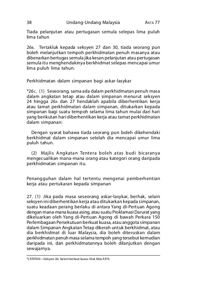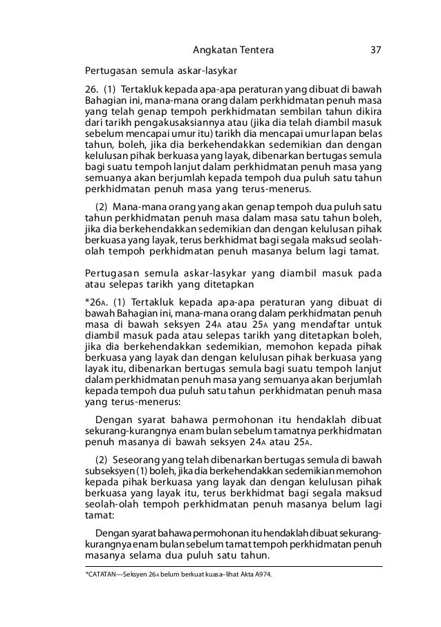 Kepada yang masih tidak tahu, atau pura-pura tidak tahu, ataupun sememangnya tidak mahu ambil tahu, terdapat Rang Undang-Undang atau Akta yang melarang pihak-pihak yang tidak layak memakai pakaian tentera, dan juga mengguna peralatan ketenteraan mengikut kehendak hati mereka. Akta Angkatan Tentera 1. Akta Angkatan Tentera 1. Penanggohan dalam hal- hal tertentu mengenai pemberhentian kerja atau pertukaran kepadasimpanan. Jun 25, 2013 - U. (A) 183 AKTA ANGKATAN TENTERA 1972 PERATURAN-PERATURAN ANGKATAN TENTERA (TERMA-TERMA PERKHIDMATAN BAGI.